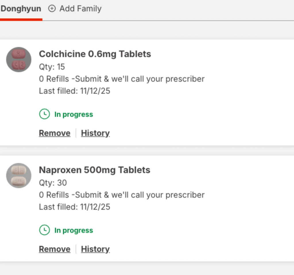 한국에서는 닥터나우 같은 원격 진료가 있다면, 미국에서는 Walgreens의 Virtual healthcare가 있는 것 같다. 앱에서 예약을 잡으면 의사와 영상통화로 비대면 진료를 볼 수 있다. 영어로 직접 대면해서 말하는 것보다는 화면으로 보니 조금 덜 부담스러웠고, 부은 발을 카메라로 보여주면서 통풍 증상을 설명할 수 있었다.